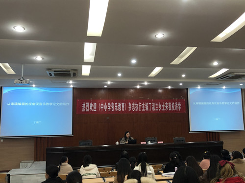 11月24日下午3:20,我系邀请中国音乐家协会会员、《中小学音乐教育》杂志执行主编、浙江省文联传媒中心编辑出版部主任,副主编丁淑兰女士来校作学术讲座。此次讲座主题为《从审稿编辑的视角谈音乐教学论文的写作》。讲座由闫兵副主任主持,徐州市音乐家协会李姗姗秘书长和部分会员,我系陈繁书记、儿童数字音乐中心负责人高志副教授和部分师生代表参加了活动。