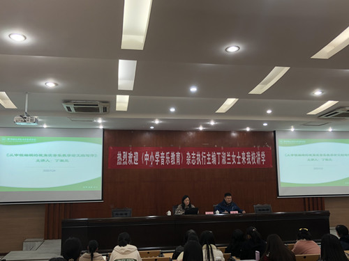 丁主任以音乐教育论文投稿这一事项作为逻辑起点,将学术话语置于投稿的基本流程、注意事项等环节中,向现场师生们详细阐述了音乐教育论文的写作要点以及写作中存在的普遍问题和解决方法。
