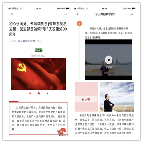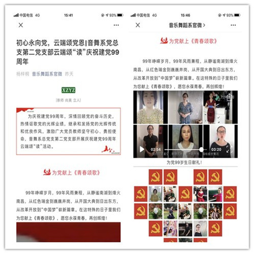 为庆祝中国共产党成立99周年,音乐舞蹈系党总支开展了“初心永向党,云端颂党恩”主题党日活动。各支部精心策划、认真组织,发挥专业优势,为党送上生日祝福。