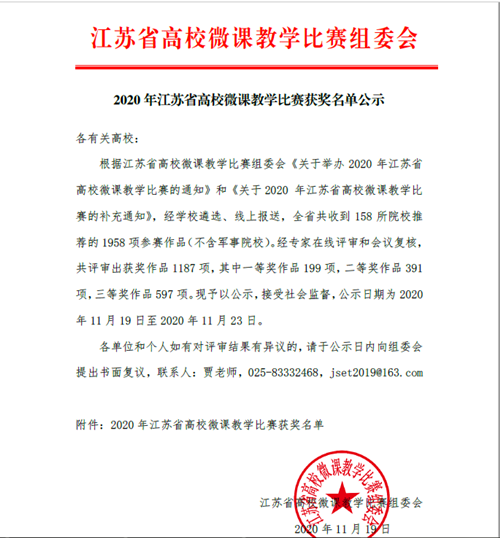 近日,2020年江苏省高校微课教学比赛评选结果揭晓,我系教师参赛作品在此次比赛中荣获一等奖两项,二等奖一项。其中马亚琼老师的作品《沛筑演奏基础技法》和毛敏老师的作品《钢琴即兴伴奏中的创新---以<我爱这蓝色的海洋>为例》荣获一等奖,蔡艳教授的作品《揭开藏族舞蹈屈伸动律的奥秘》荣获二等奖。