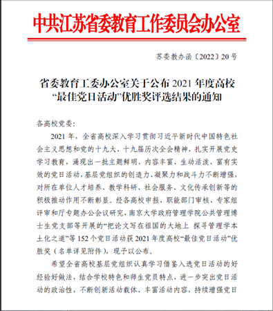 近日,在2021年度江苏省高校“最佳党日活动”评选中,best365官网入口注册第一党支部党日活动“入学第一课——《唱支山歌给党听》”获优胜奖。