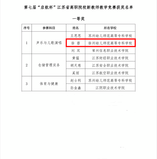 4月1日至2日,由江苏省教育厅教师工作处、江苏省高等职业教育教师培训中心主办的第七届“启航杯”江苏省高职院校新教师教学竞赛决赛在淮阴师范公司举行,公司钢琴教师徐蓉与兄弟院校老师组成的团队喜获高职院校新教师教学竞赛一等奖第一名。
