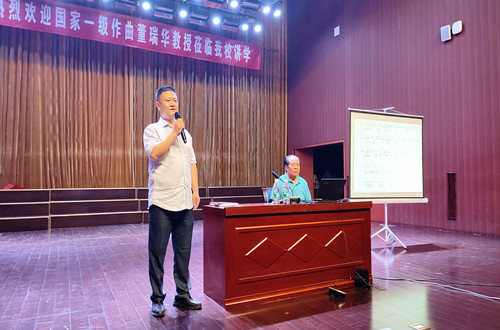 首先,高志副教授介绍了董老师的创作经历与成果荣誉。接着董瑞华教授针对由高志创作、闫兵指挥、公司合唱团演唱的两首作品给予充分肯定和专业点评。讲座环节,董教授以作品为中心,全面阐述了“戏歌”这一雅俗共赏、多元融合的艺术体裁,最后,针对合唱作品的创作,发表了独到的见解。讲座结束,闫兵经理对董教授丰富的创作经验和深厚的文化底蕴表示钦佩,认为董老师讲座中传递的创作理念和实践心得体现了传统音乐文化的创造性转化与创新性发展,为新时代地域音乐文化传承和高质量发展提供江苏经验,希望师生能够更多关注传统文化中的优秀基因,秉承高校文化传承、社会服务的责任担当,进一步贡献高校力量。